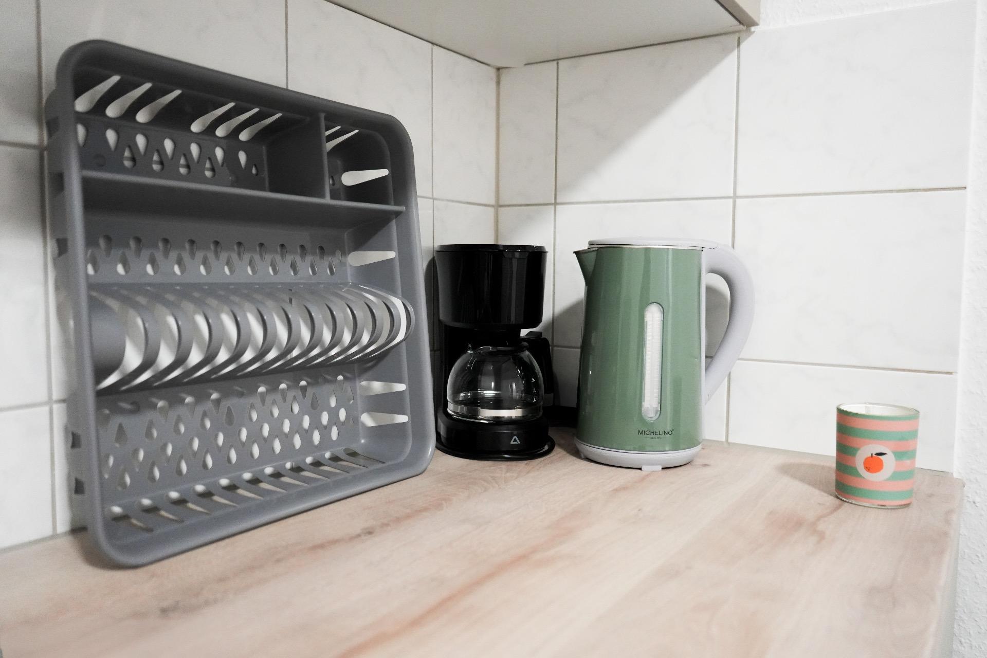 Die voll ausgestattete Küche verfügt über einen Backofen mit Ceranfeld, einen Kühlschrank mit Gefrierschrank, ein Spülbecken, einen Wasserkocher, eine Kaffeemaschine und eine Mikrowelle – ideal zum Zubereiten von Speisen. Das Extra: Kaffeesticks, Tee, Zucker, Öl, Salz, Pfeffer, Reinigungsmittel, Kaffeefilter, Zewa / Küchentücher stellen wir dir zur Verfügung. 🍽️